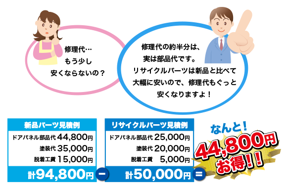 | 新品パーツで修理する場合、塗装代や元のドアから外したガラスや内装を取り付ける脱着工賃なども高くなります。その点リサイクルパーツはボディの色が同じであれば車体の色あせ具合に合せて塗装するだけ。ガラスや内装もそのまま使えることが多いので工賃も安く済むのです。 |
